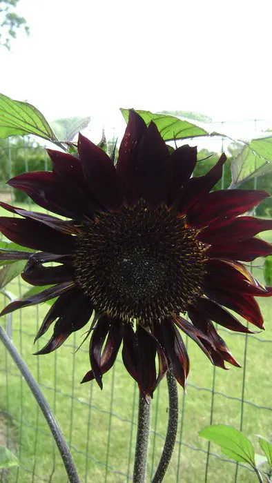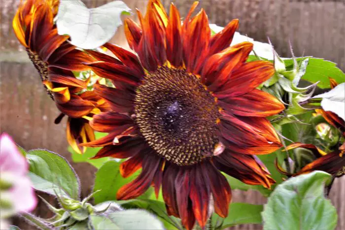 Helianthus annuus 'Moulin Rouge' bloeit met grote bordeauxrode /zwartrode bloemen.