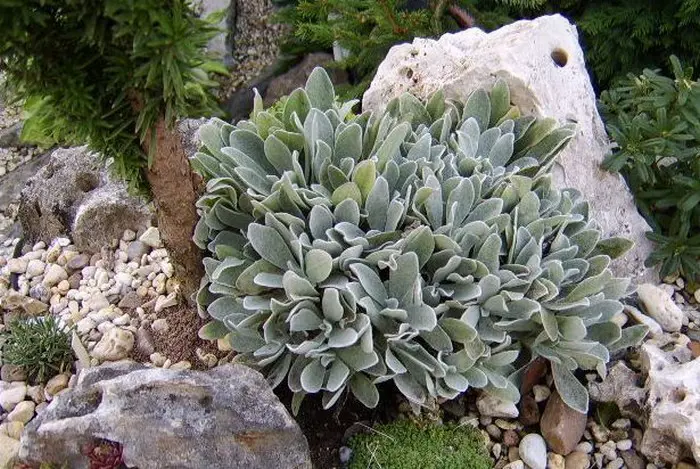 Een vaste plant met wollig behaarde spatelvormige bladeren en kleine cremewitte bloemen.