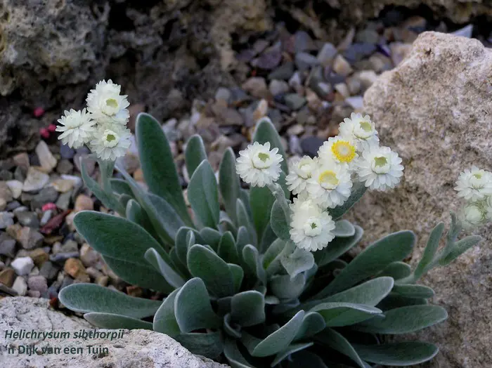 Helichrysum sibthorpii groeit in Griekenland tussen rotsspleten.