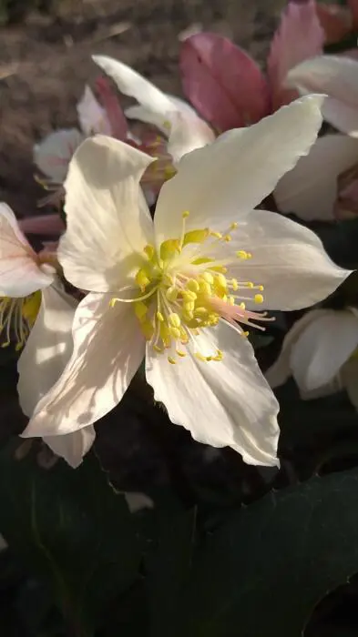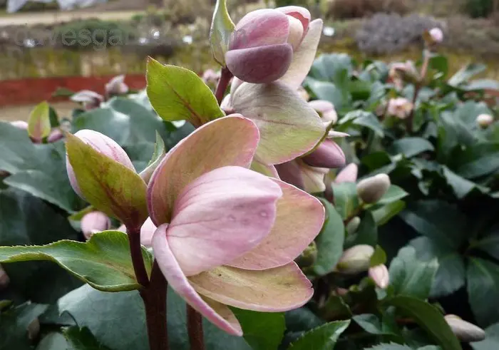 Helleborus 'Angel Glow®' is een vroegbloeiende variëteit, rond de kerst verschijnen de eerste bloemen aan bruinrode stelen. Bij aanvang zijn de komvormige bloemen witroze tot lichtroze en naarmate ze ouder worden verkleuren ze naar een donkerroze/groene tint.