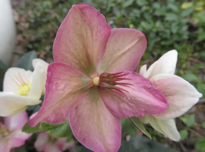 Helleborus x ericsmithii HGC 'Shooting Star' bloeit met rozige roomwitte bloemtuilen aan rode stelen.