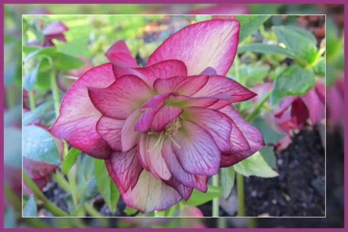 'Double Ellen Purple and Picotee' cremegroen/lichtroze, paarsrood gerand.