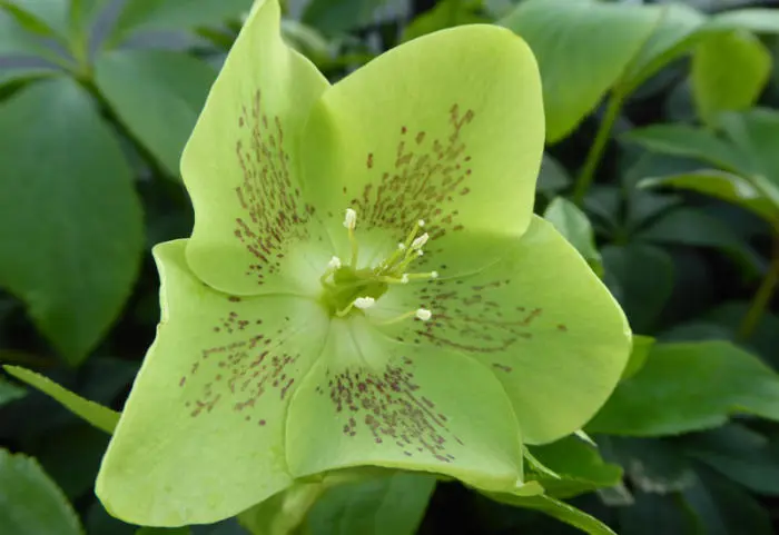 De bloemen van de Helleborus orientalis 'Green Spotted' zijn groen en roodpaars gespikkeld.