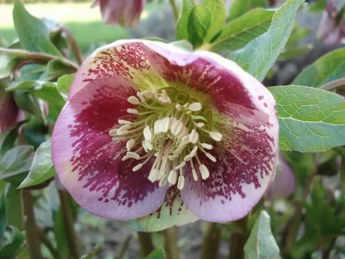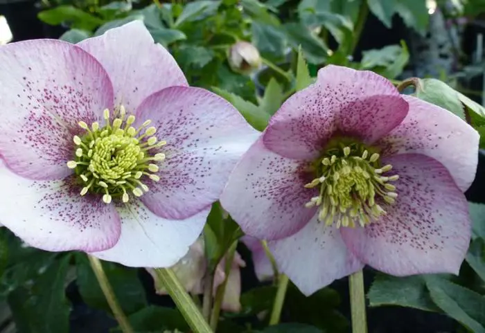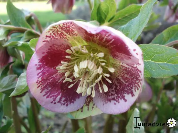 Helleborus orientalis 'Pink Spotted' is roze met roodpaars gespikkeld.