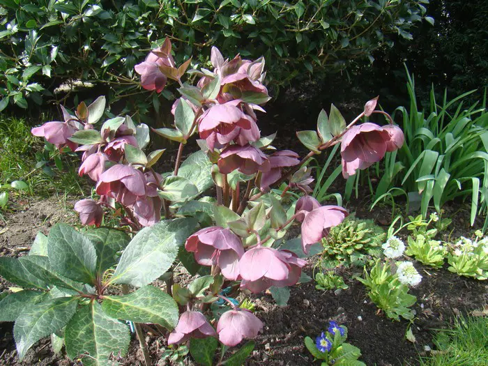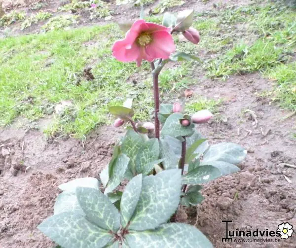 Helleborus 'Penny's Pink' uit de Winter Beauty groep, bloeit aan paarsrode stengels met paarsroze tot helderpaarse bloemen die naar groen verbloeien.