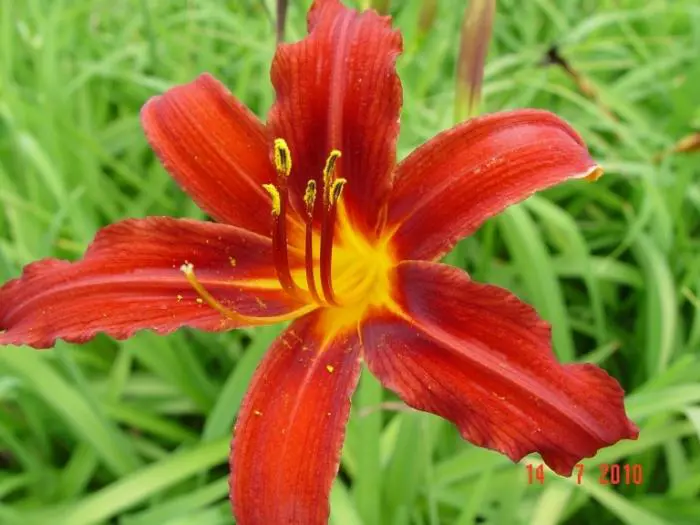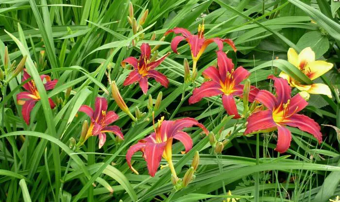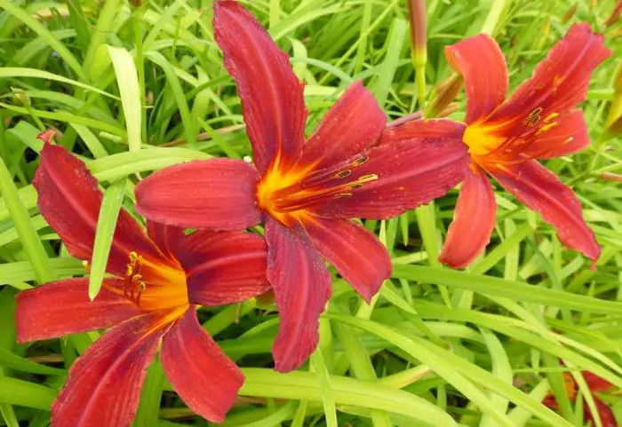Hemerocallis 'Crimson Pirate' bloeit met grote bloemen, bruinrood met een oranjegele keel.