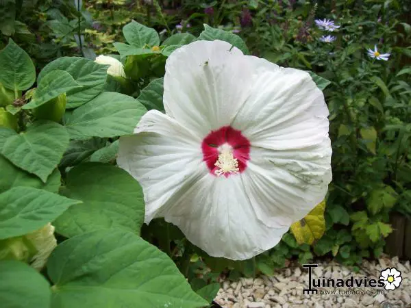 H. 'LUNA White' bloeit wit met een robijnrood oog in het midden.