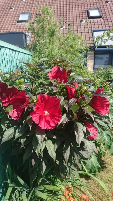 De grote komvormige bloemen zijn 20-25cm groot en scharlakenrood.