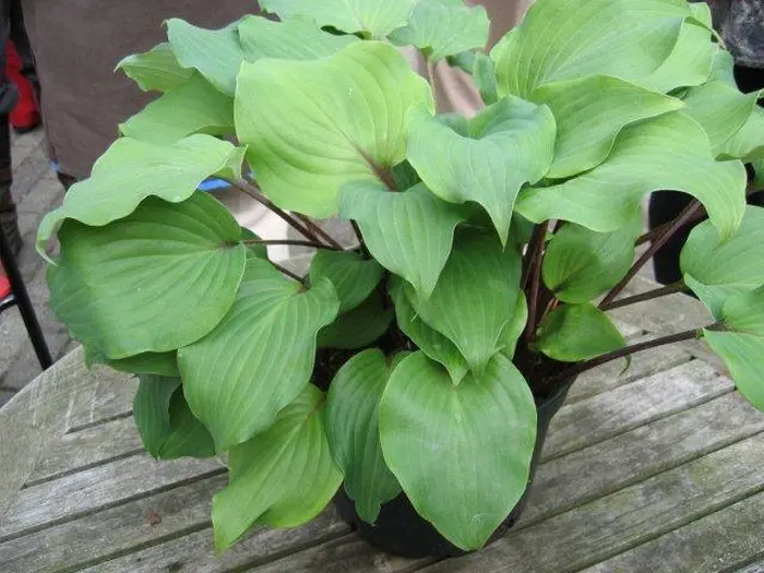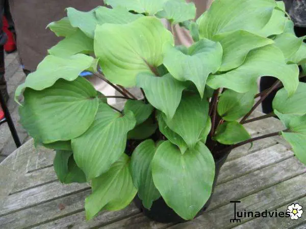 Hosta 'Harry van de Laar' heeft een groot grijsgroen blad waarvan de achterkant bleker is.