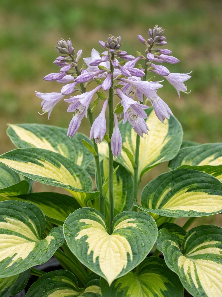 De bladeren van Hosta 'Center of Attention' zijn cremekleurig met een groene rand.