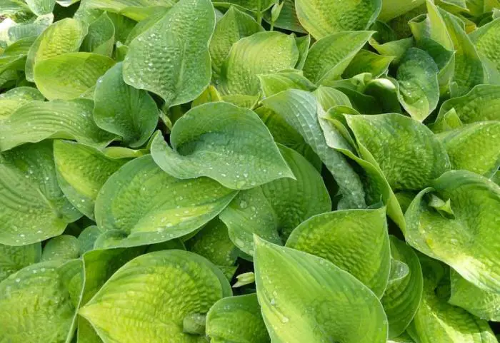 Hosta 'Paradigm' heeft groengele geribbelde bladeren met een groene rand.