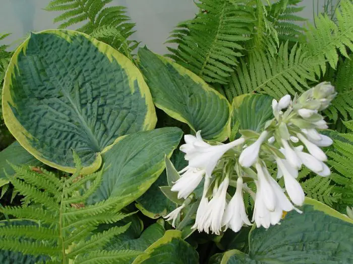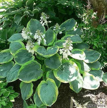 Wordt als één van de mooiste hosta's aanzien met zijn blauwgroene bladeren en gele randen, bloeiend met (bijna) witte trompetachtige bloemen.