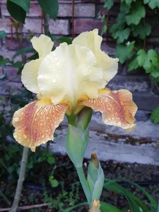 Iris germanica 'Golden Muffin' bloeit met tweekleurige bloemen, bleek gele petalen en rood gestreepte, lichtbruine sepalen.