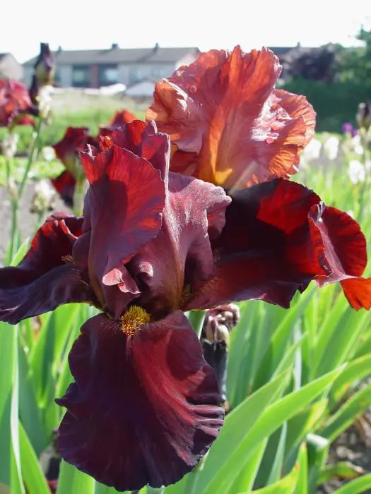 Iris germanica 'Sultan's Palace' bloeit met oranjekoper-bruinrode bloemen met een warme oranjegele baard.