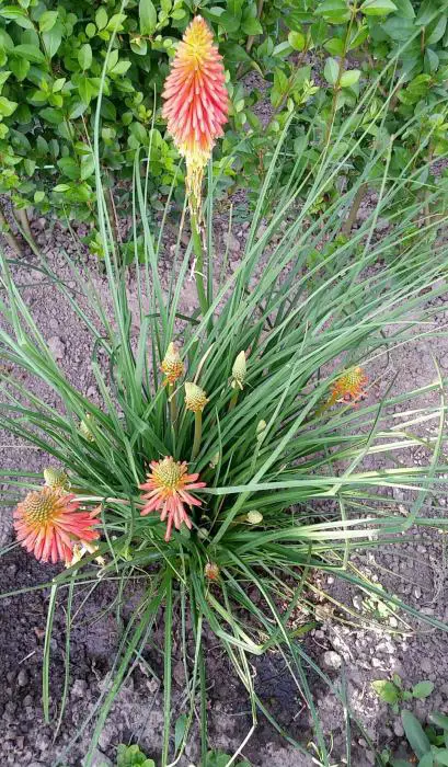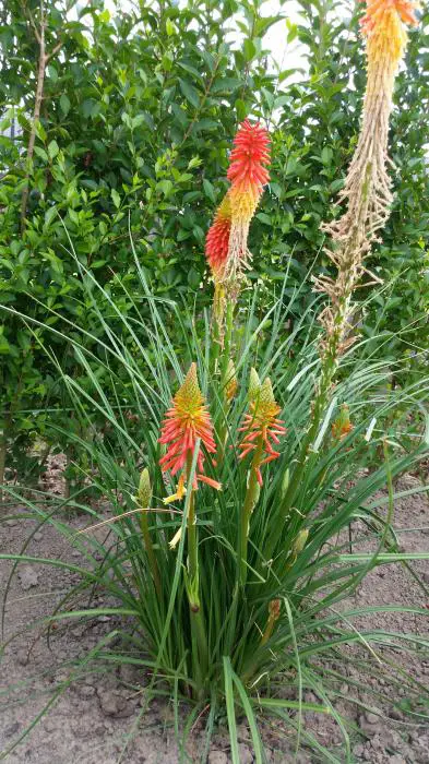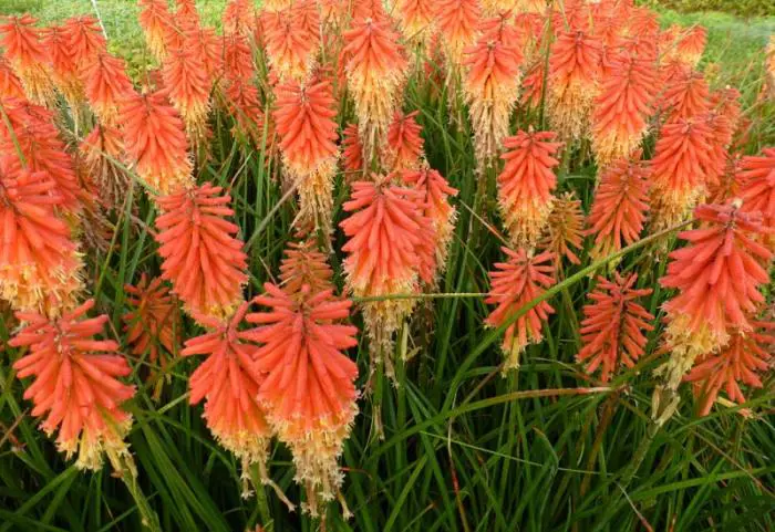 Kniphofia uvaria 'Papaya Popsicle' is een lage cultivar van 35cm hoog.