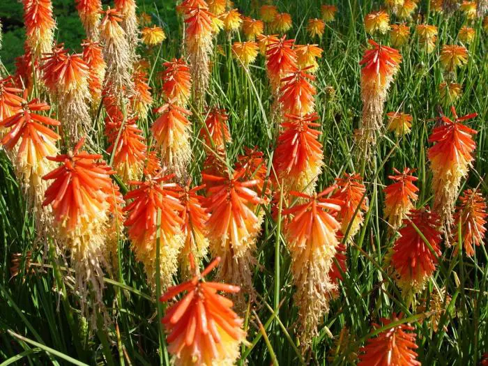 Kniphofia POPSICLE is een serie met een meer compacte groeiwijze, een lange bloeiperiode en een goede herbloei. Bloeien op lange kale bloemstengel met aarvormige bloemtrossen.