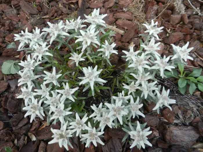 Leontopodium souliei 'Alpina White' of Edelweiss, het zo bekend plantje en symbool van de Alpen.