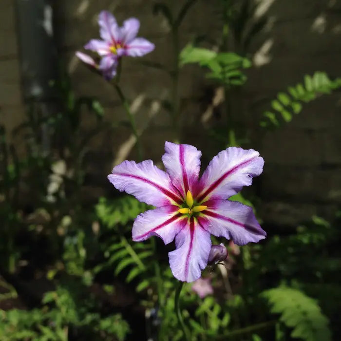 De stervormige bloemen geuren wel aangenaam, zijn blauwpaars met een roodpaarse streep op de bloemblaadjes en roodpaars rond een groengele keel.