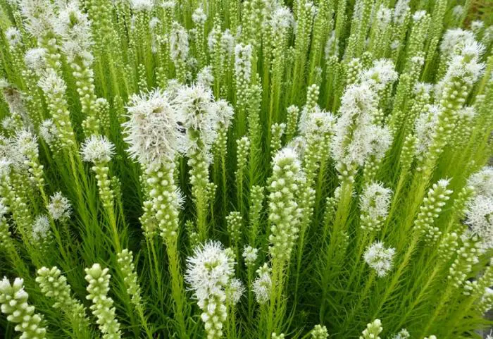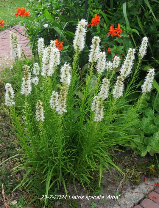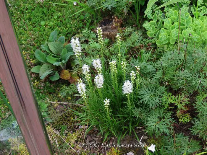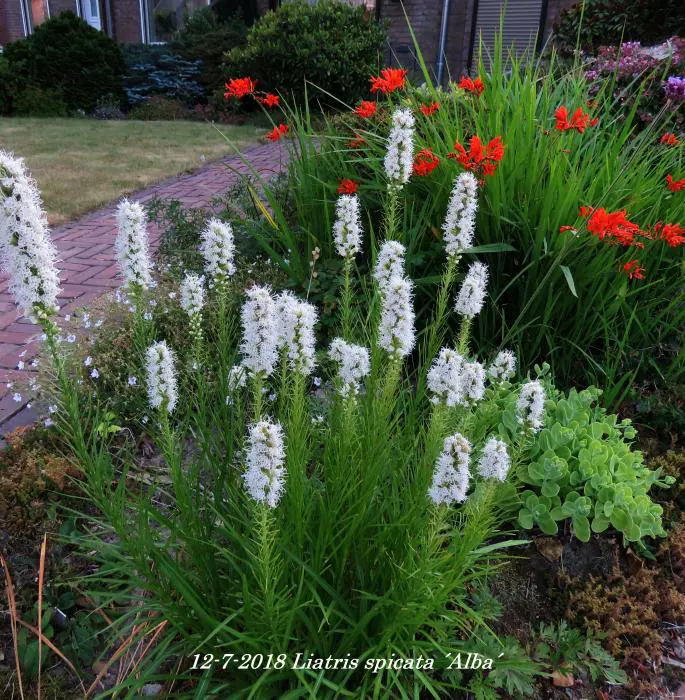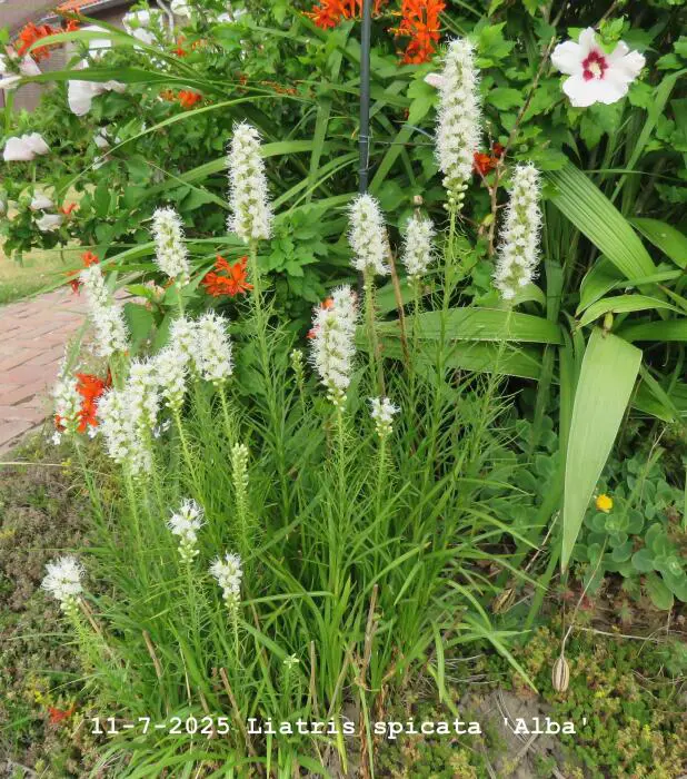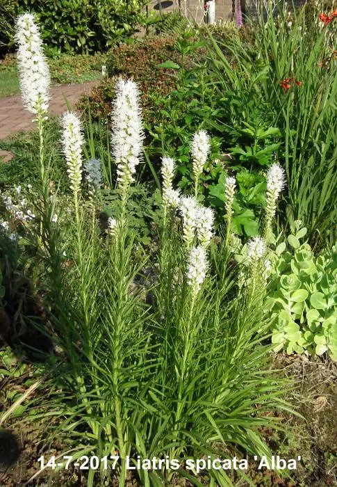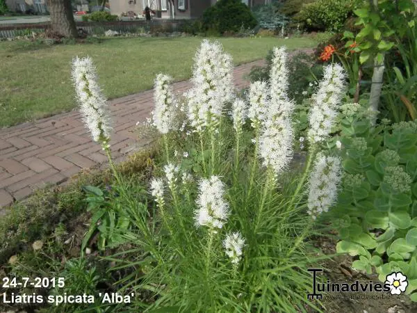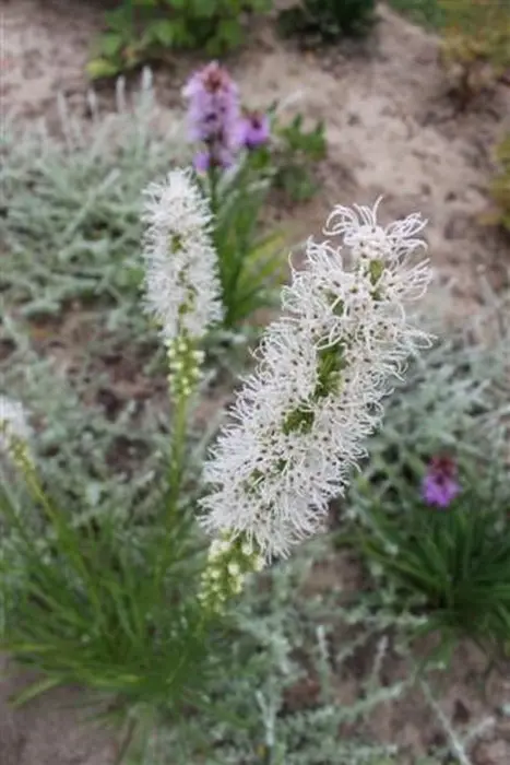 Merkwaardig is dat de bloei bovenaan de aarvormige groeiwijze begint. De bloemen van de L.spicata 'Alba' zijn iets minder wit dan de L. spicata 'Floristan Weiss'.