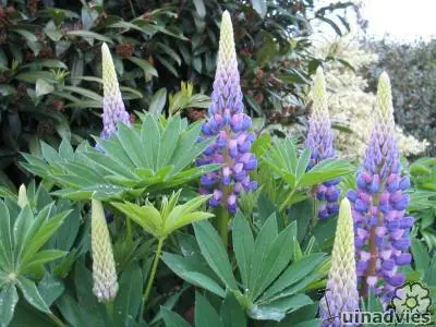 Deze overblijvende lupine biedt grote rechtopstaande azuurblauwe aren met een witte vlag die verticaliteit en een heel vrolijk tintje aan de borders geven. Ze vormen prachtige bosjes met diep verdeelde, heldergroene bladeren.