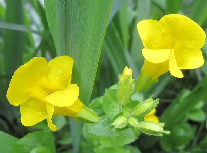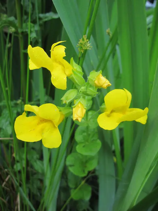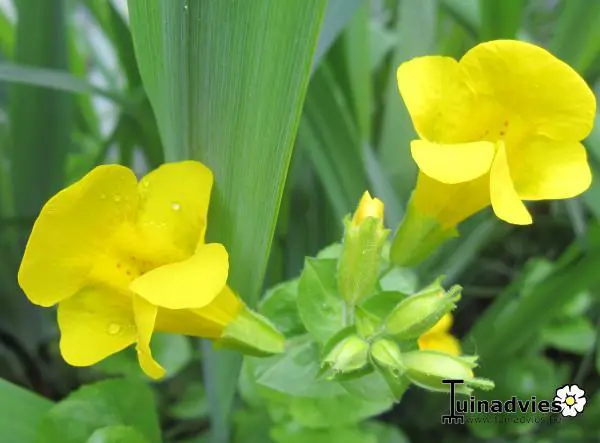 Mimulus guttatus staat graag op een vochthoudende bodem of drassige plek langs een vijver.