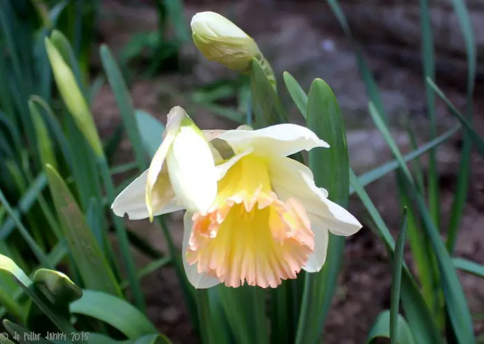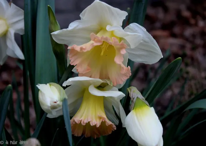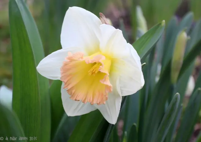 Narcissus 'British Gamble' bloeit ivoorwit met een zalm/gele lange trompet.
