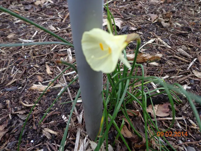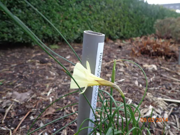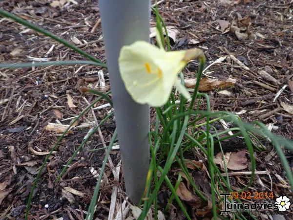 Narcissus bulbocodium bloeit met trechtervormige gele bloemen, de bladeren zijn grasachtige.