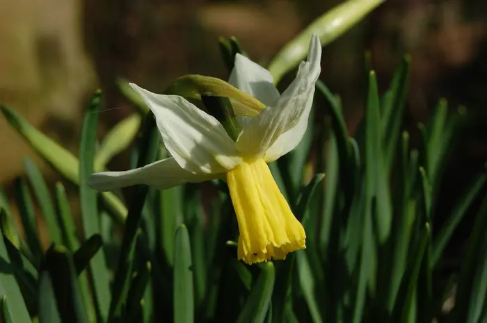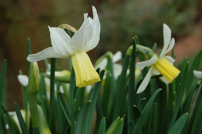 De kleine bloemen zijn wit met smalle teruggeslagen bloemblaadjes en zachtgele slanke trompetten.
