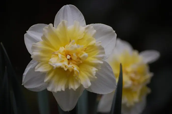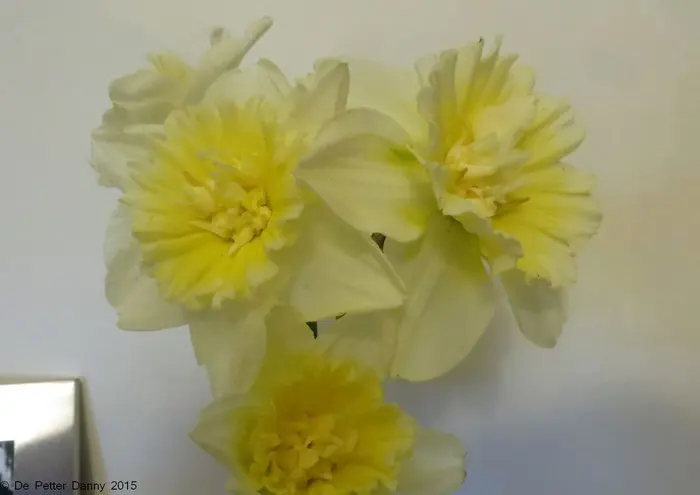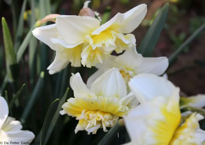Narcissus 'Ice King' is een dubbele narcis, bloeit met witte bloemblaadjes en een citroengele tot cremewitte gevulde kroon.