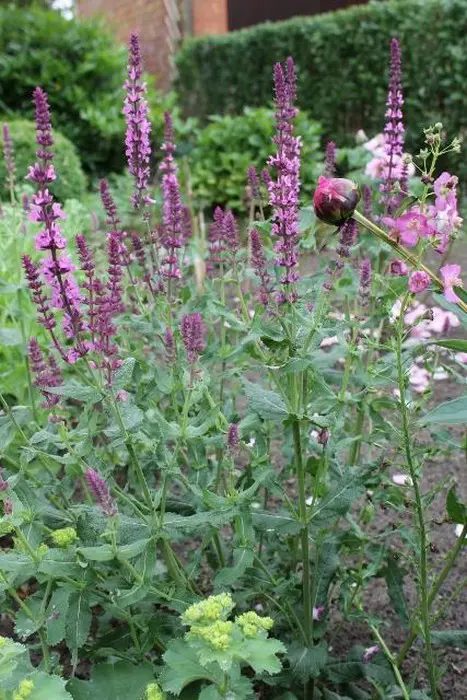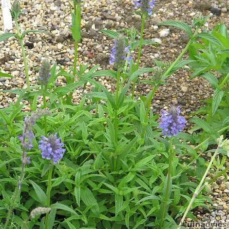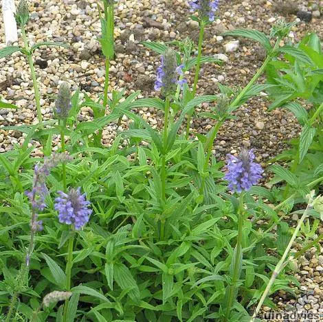 Vormt een prachtig bossig pol, met een langwerpig grijsgroen, gerimpeld, licht aromatisch blad, waaruit de hele zomer lange bloemstelen tevoorschijn komen met dichte aren van paarsblauwe bloemen.