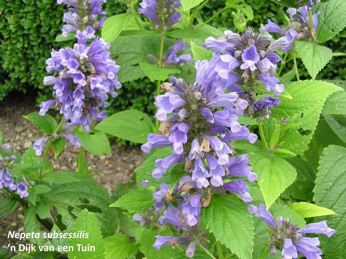Nepeta subsessilis verkiest in tegenstelling tot de andere Nepeta's een vrij vochtige grond zo niet wordt het blad geel.