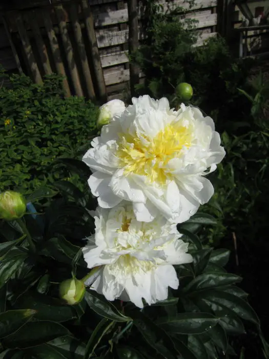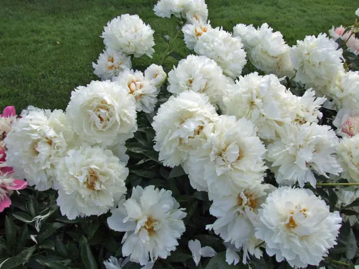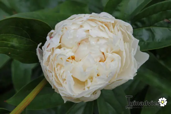 P. 'Bowl of Cream' bloeit met grote goed gevulde roomwitte bloemen.