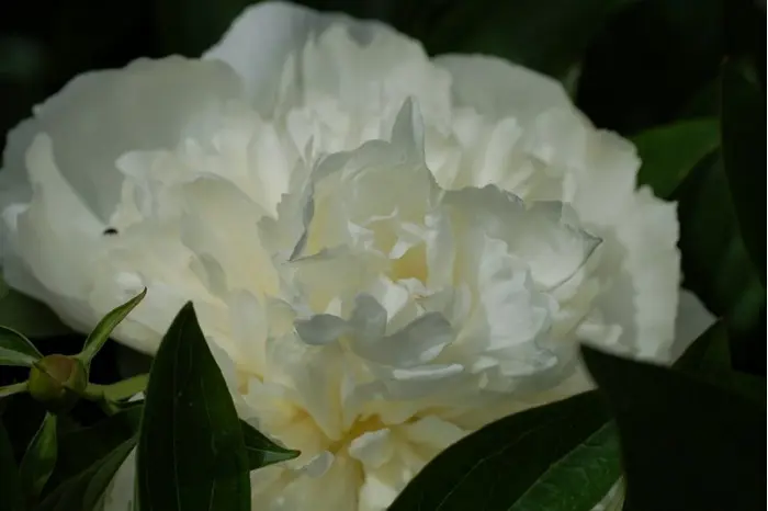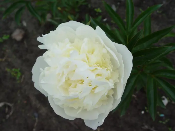Paeonia lactiflora 'Duchesse de Nemours' bloeit met goed gevulde bloemen.
