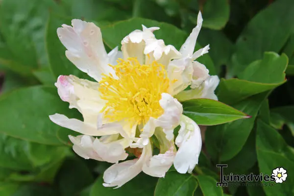 Paeonia lactiflora 'Green Lotus' bloeit met limoenkleurige kroonbloemblaadjes met een roze toets. In het hart opvallende goudgele lange meeldraden.