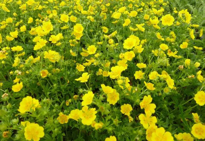 bloei in de zomer met boterbloemachtige, goudgele bloempjes.