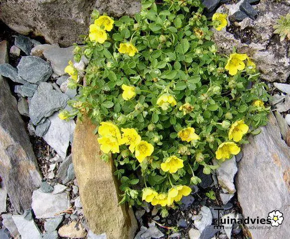 Potentilla eriocarpa is een compacte vaste plant met stugge stengels en heldergroene bladeren.