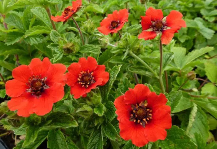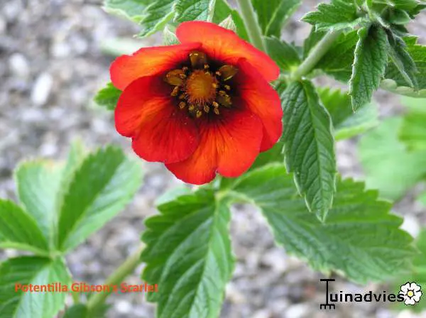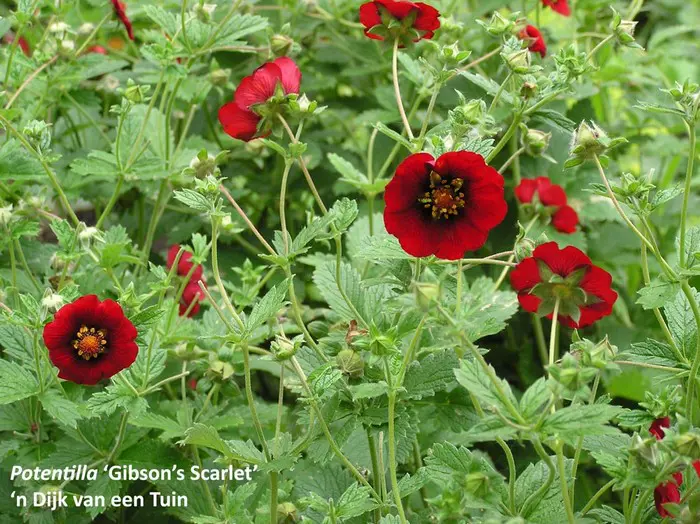 Potentilla 'Gibson's Scarlet' is een meerjarige, kruipende plant uit Nepal en biedt de hele zomer intens scharlakenrode bloemen.