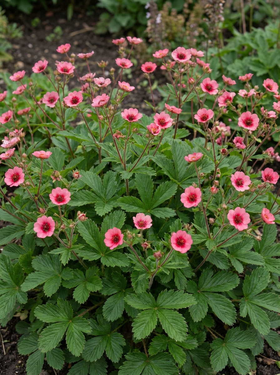 Potentilla nepalensis 'Miss Willmott' is een meerjarige Himalaya-plant en biedt de hele zomer wolken van kersenroze tot zalmroze bloemen met dieprood in het hart.