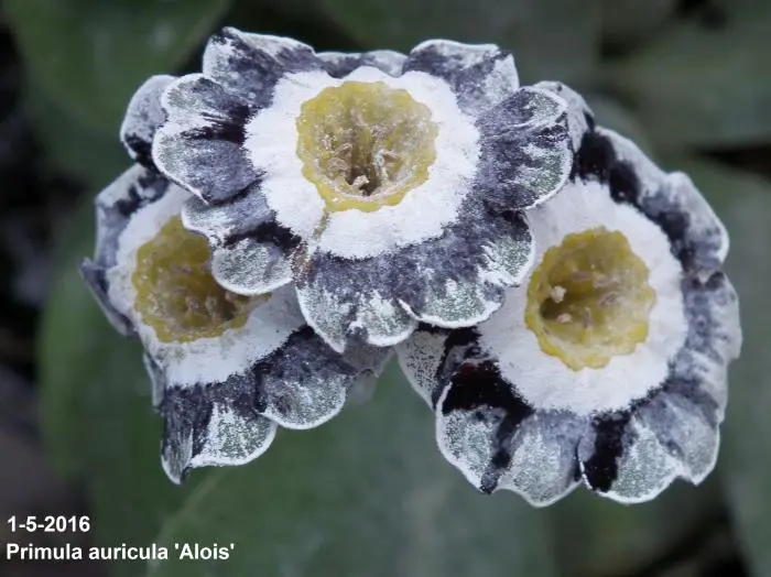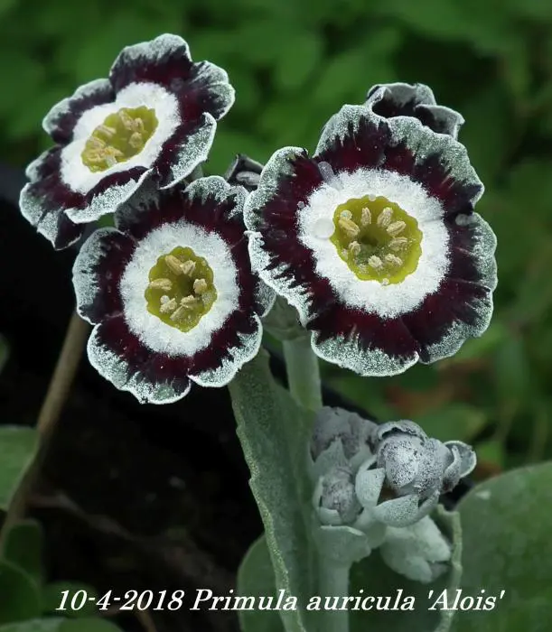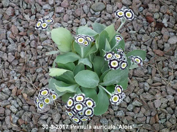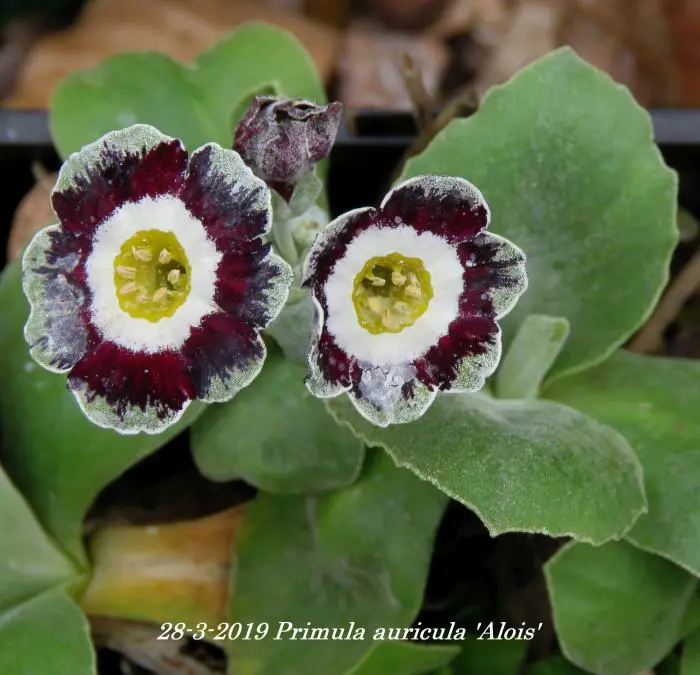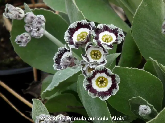 Primula auricula 'Alois' is oorspronkelijk een alpineplantje met zacht donsachtige blaadjes. Bloeit met opvallende witte bloemen met een zwartrood/-paarse ring met zilveren rand en een geel centrum.