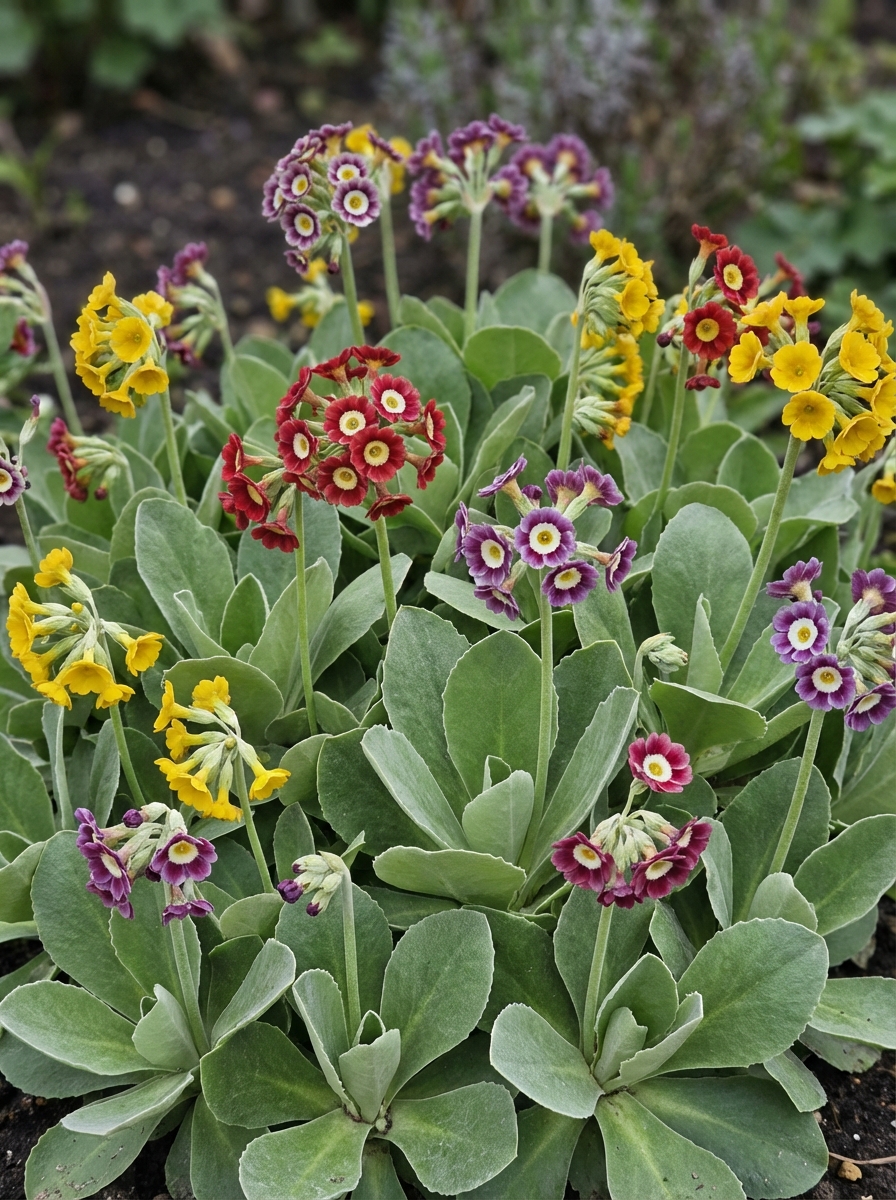 Primula auricula is oorspronkelijk een alpineplantje met zacht donsachtige blaadjes en bloempjes in diverse kleuren van roze, geel, blauw, rood, wit....
