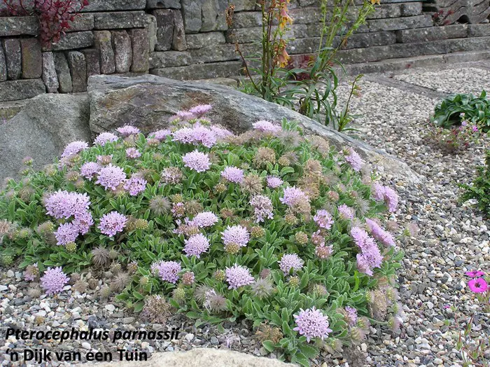 De paarsroze bloemen lijken erg op die van de Scabiosa.