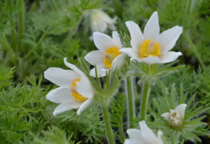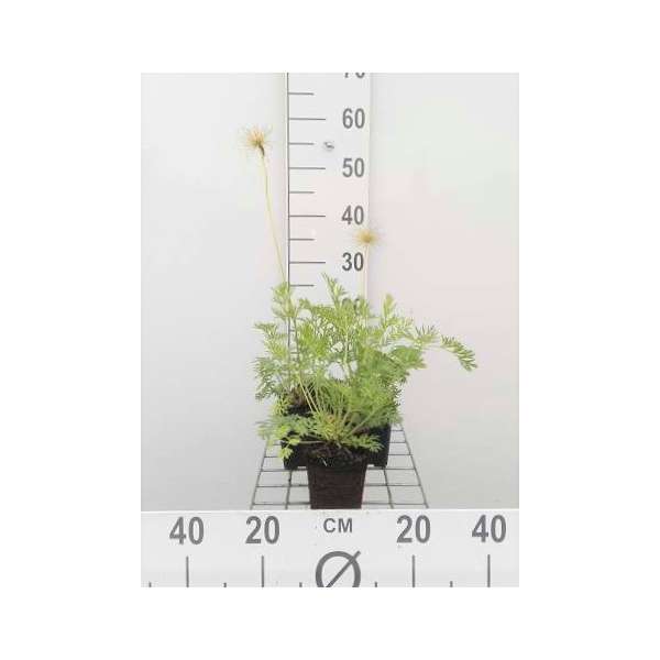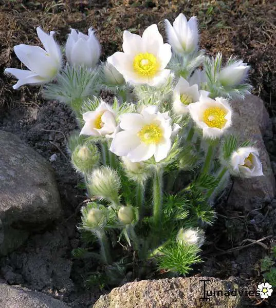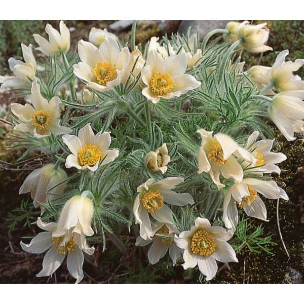 Pulsatilla vulgaris 'Alba' bloeit in het vroeg voorjaar, 15cm hoog en nà de bloei wordt hij 40cm met ronde behaarde pluimvormige zaadhoofdjes.