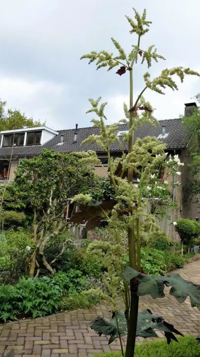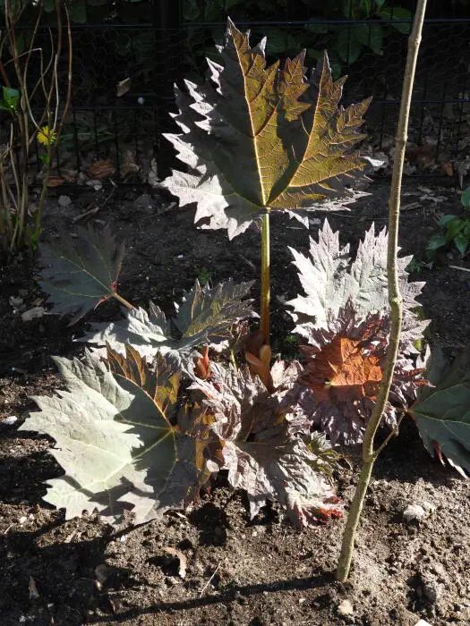 Rheum palmatum 'Atrosanguineum' heeft grote handvormige bladeren die bij het uitlopen paars zijn en groen verkleuren naar de zomer toe.