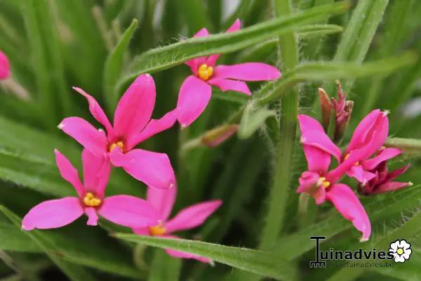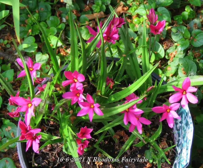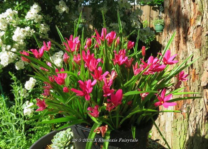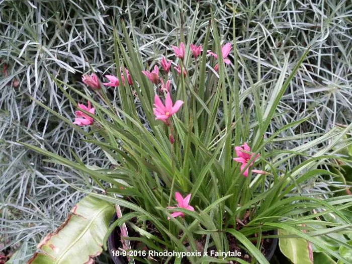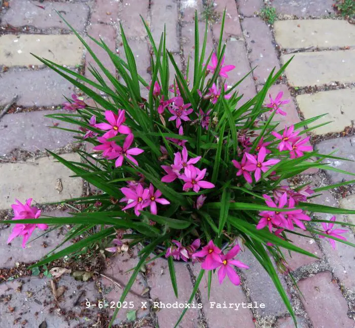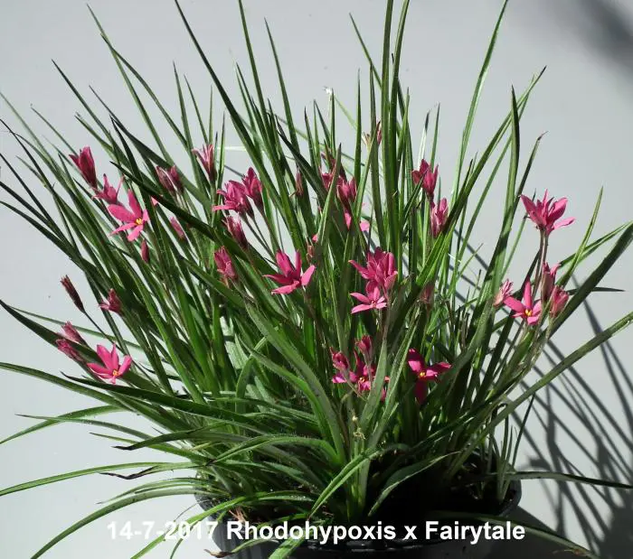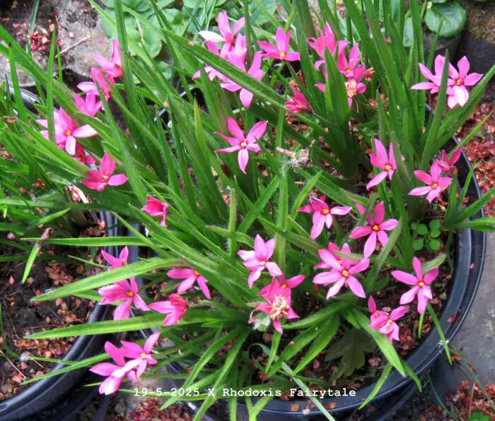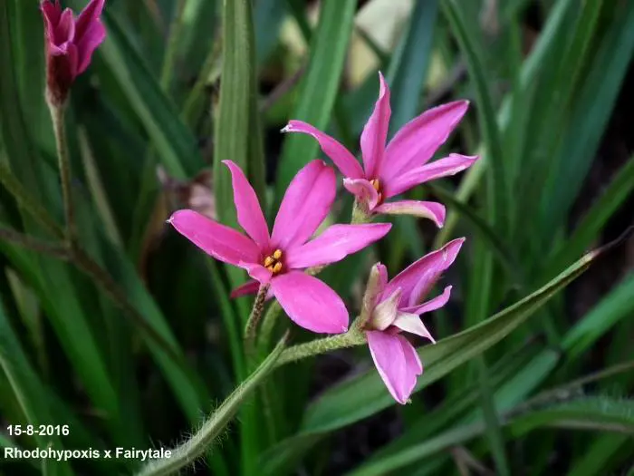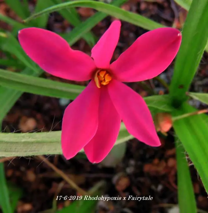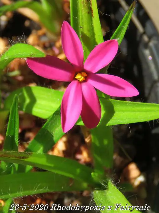 × Rhodoxis Fairytale bloeit rozerood met een geel hartje. Wordt 25cm.