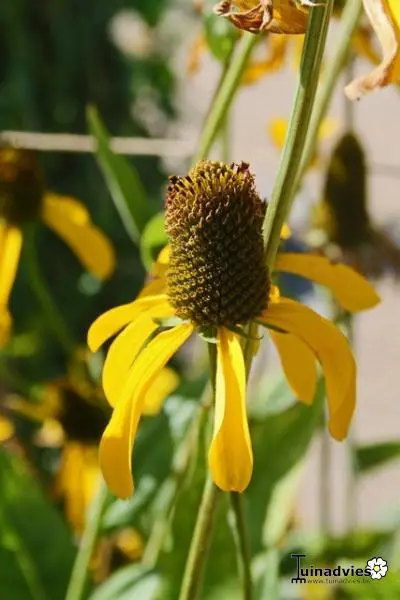 Het is een vaste plant met lancetvormige grote bladeren en groengele bloemen met in het midden een erg hoge bronsgroene tot bruine kegel.