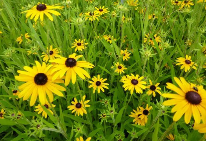 Bloeit op rechtopstaande stengels met goudgele straalbloemen met een donkerbruine kegel in het centrum. De bloemen van deze Rudbeckia zijn iets kleiner.