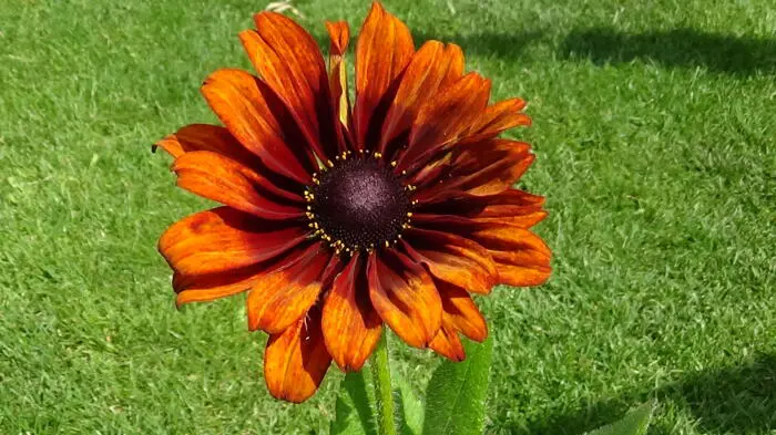 Rudbeckia Summerina Orange bloeit met grote oranje bloemen met in het centrum een roestoranje halo rond een chocoladebruine kegel.