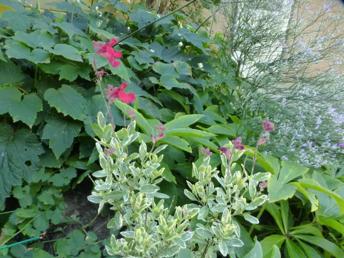 Salvia greggii 'Dessert Blaze' is een bossige compacte, goed vertakte plant met aromatische, creme/gele gerande, grijsgroene bladeren.