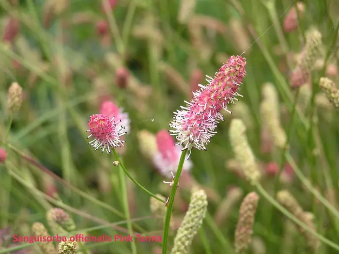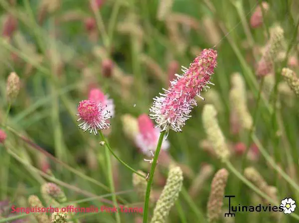 Sanguisorba officinalis 'Pink Tanna' is een bossige plant met een rijke, sierlijke bloei in het hartje van de zomer met lichtjes hangende, donker- tot witroze dichte aren aan stevige stengels.