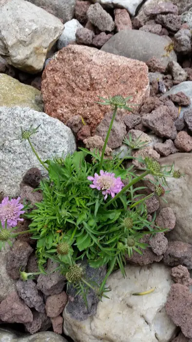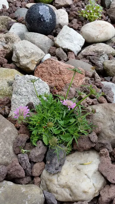 Scabiosa japonica 'Pink Diamonds' is een kussenvormend rotsplantje met grijsgroene bladeren en roze bloemen.